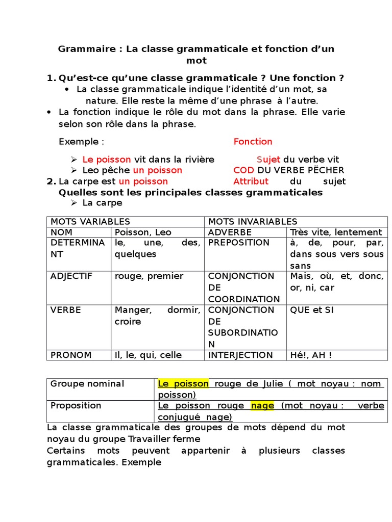 Les Classes Grammaticales Pdf Nom Grammaire Pronom